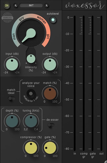 “簡単な操作で”とのことだったのですが、サチュレーターやマイクプリ・シミュレーター辺りは他の方が紹介してくださると思うので、僕からは“朗読音声”に特化したプラグインを推薦します。朗読やポッドキャストの音声をしばらく分析させて、その後は適用度や声の質感(大人の男性、若い女性、など)を好きな値で作っていけるプラグインです。ゲートやディエッサーやコンプレッサーも付いているので、まさに簡単な操作で、音声の処理が完了します。僕自身は、ボーカル・ミックスのときのように楽器的な耳触りの良さを追求するためではなく、喋り声として説得力のある響きにするためにVoxessorを使っています。