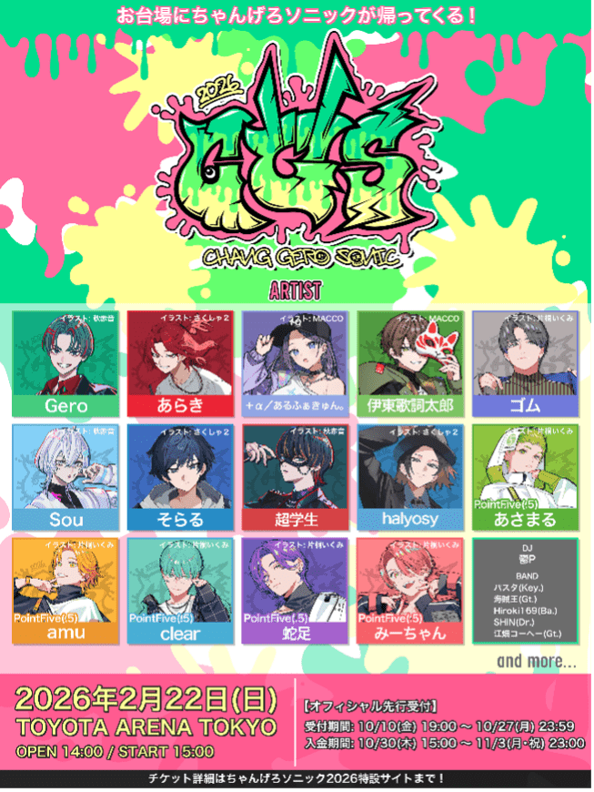 歌い手Geroが主催するライブイベント「ちゃんげろソニック2026」が、4年振りに2026年2月22日(日) TOYOTA ARENA TOKYOにて開催される。