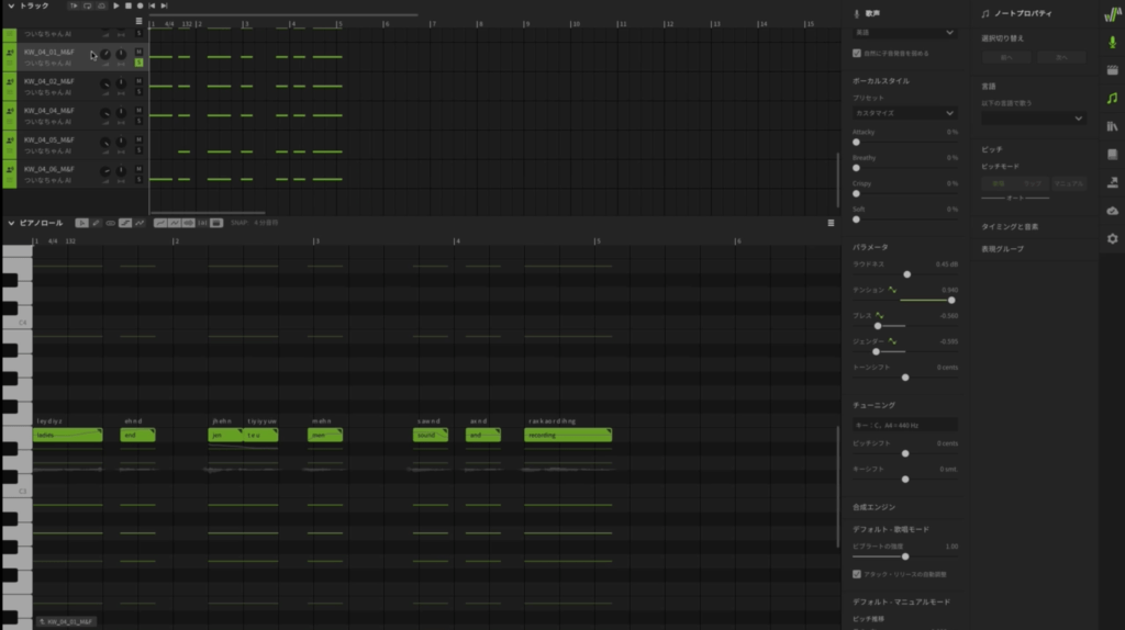 1tr目は装飾系のトラックで、少しピッチが高く音量は小さめ。男声でも発音を聴かせるためには、少し高いピッチの音も入れておくのがポイントです。