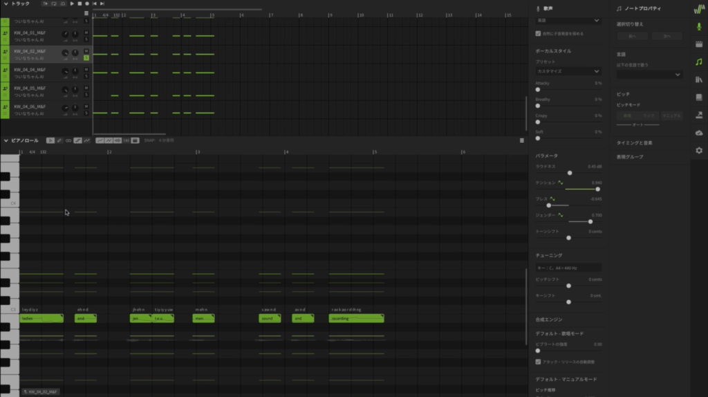 5tr目は、ピッチの低い装飾系トラック。テンションを上げ、ブレスを下げ、ジェンダーを上げることで、鼻をつまんだような声質にしています。